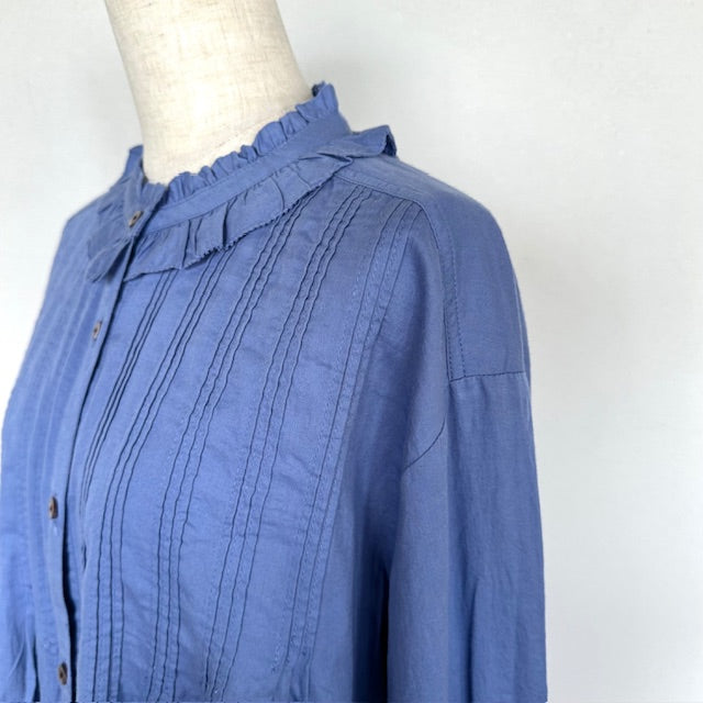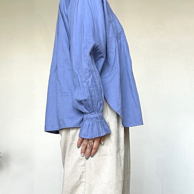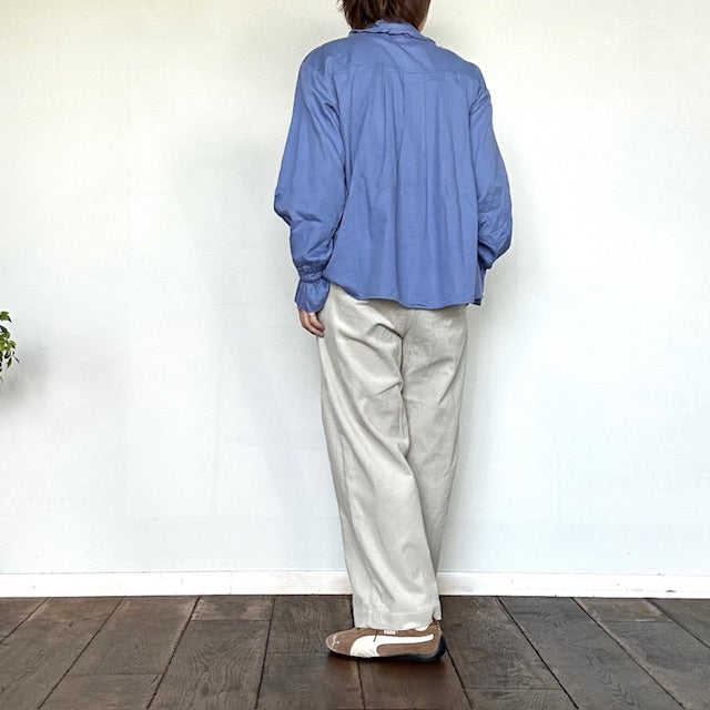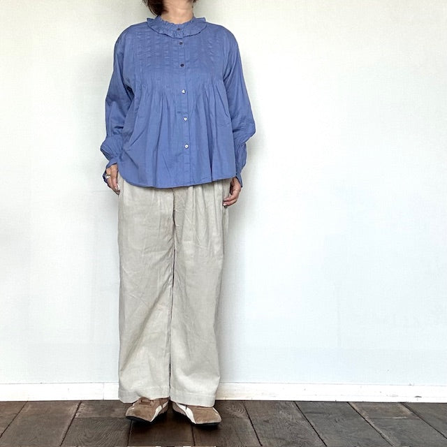 程よく甘さを抑えたフリルカラーとピンタックが素敵なブラウス。